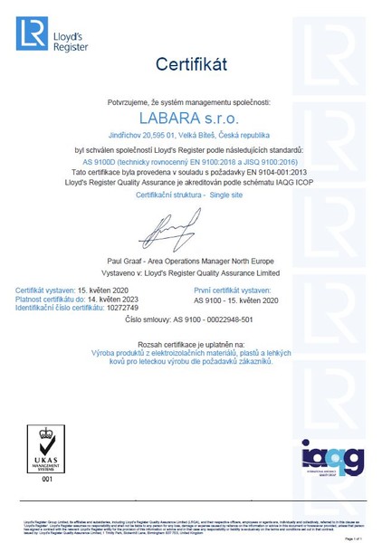 Labara je držitelem certifikátu AS 9100D, ISO 9001:2015, UL Certificate of compliance a EKOKOM.